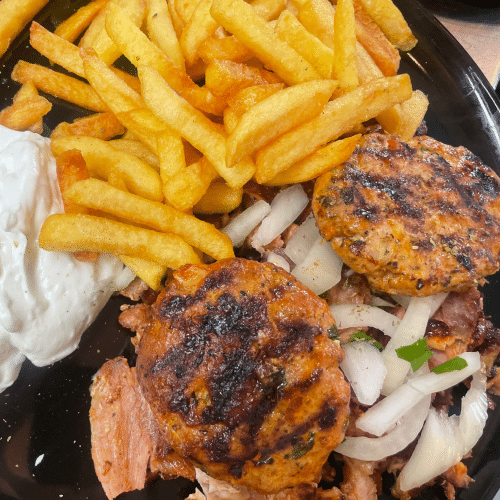 mit Hacksteak und Tzatziki, Zwiebeln, Pommes und Krautsalat